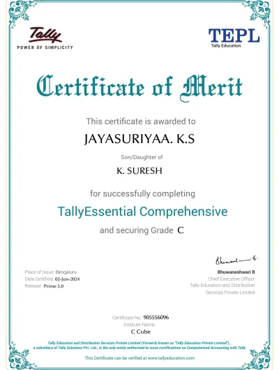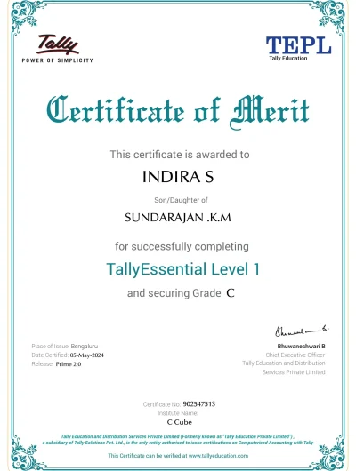 Trustindex verifies that the original source of the review is Google. Good coaching really very helpful to me🥰 Vibi Rakshi2025-04-23Trustindex verifies that the original source of the review is Google. Iam A.Shalini Excel college for commerce and science iam studying for textile fashion designing use full of tuka class Shalini Nivi2025-03-18Trustindex verifies that the original source of the review is Google. Boopalan excel college for commerce and science komarapalayam 3rd B.sc costume design and fashion we are contacting my clg cad work shop so this cad work shop is very good class more useful ʙᴀʟᴀ2025-03-18Trustindex verifies that the original source of the review is Google. I'm Vijay, from kavindapadi,this institute python course complete very very useful full training and over knowledge guides and future work suggestions and help full teams Vijay Vijay2025-03-03Trustindex verifies that the original source of the review is Google. I am Sangavi , Pursuing B.Com and CA.I joined here for Tally course successfully got Tally certificate with A grade.C Cube services, sessions , classes everything was very good and Friendly.Thank you C Cube Sangavi S2025-02-28Trustindex verifies that the original source of the review is Google. I learned Tally Prime with Gst one of the best Tally training institute in Erode and assessments are very great experience to score good marks Thulasi K ECE-18-0862025-02-28Trustindex verifies that the original source of the review is Google. Tally Prime course I learned very good Ridharsan R V Vivekanandhan S R2024-12-11Trustindex verifies that the original source of the review is Google. He teaching wall in tuka Cad and well experience staff and well know staff.we will discuss about photoshop,coral draw. M.Praveen kumar2024-11-28Verified by TrustindexTrustindex verified badge is the Universal Symbol of Trust. Only the greatest companies can get the verified badge who has a review score above 4.5, based on customer reviews over the past 12 months. Read more
